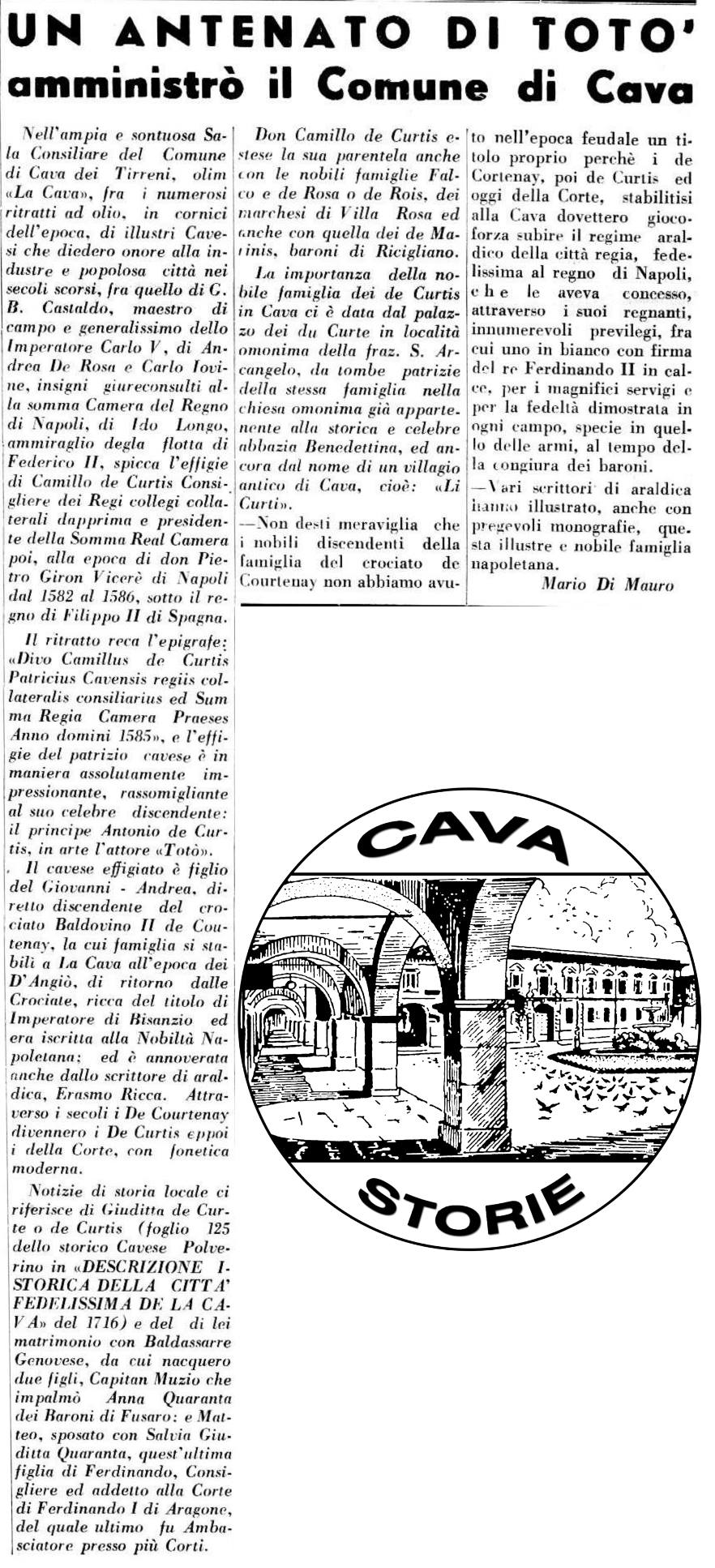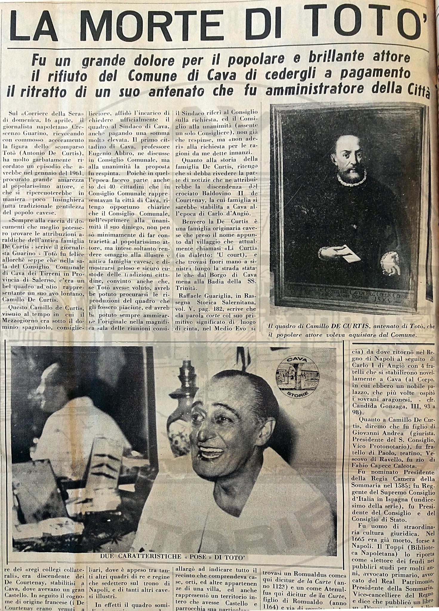 A testimoniare la notizia fu il giornale “Il Castello” che nel gennaio 1961 scriveva: “Se Totò vorrà vedere il suo antenato, potrà recarsi ogni tanto a Cava; così anche i cavesi avranno il piacere di vedere lui di persona, e non solo sullo schermo.”