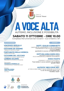 L’11 ottobre alle ore 10 presso il Complesso San Giovanni, si terrà l’incontro/convegno dal titolo “A voce alta! Autismo, inclusione e possibilità”. Parteciperanno ai saluti istituzionali il Sindaco di Cava de’ Tirreni Vincenzo Servalli, il Sindaco di Vietri sul Mare Giovanni De Simone, il Sindaco di Cetara Fortunato Della Monica, l’Assessore con delega ai Servizi Sociali del Comune di Cava de’ Tirreni Giovanni Del Vecchio e l’Assessore con delega alla Pubblica Istruzione Lorena Iuliano. Interverranno il Dott. Giulio Corrivetti, Direttore del Dipartimento di Salute Mentale e Vice Presidente della Fondazione Ebris, la Dott.ssa Anna Maria Sica, Presidente dell’Osservatorio Cittadino sulle condizioni delle persone con disabilità, Emma Fausto, Presidente “Il Grillo e la Coccinella”, e l’attivista per i diritti delle persone autistiche Autistic Red Fryk Hey.