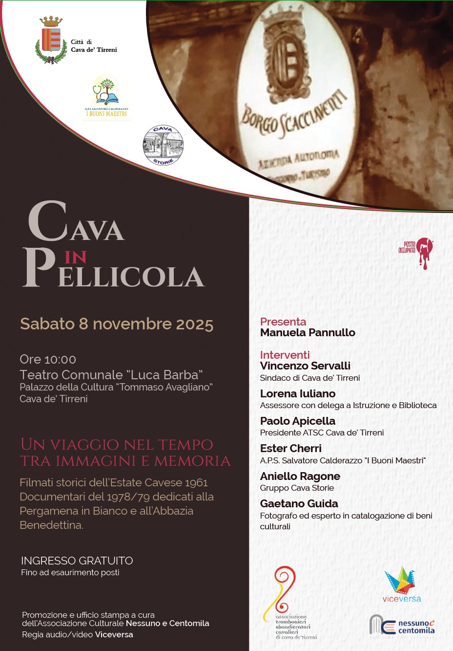 Sabato 8 novembre 2025, Cava de’ Tirreni offre un’occasione unica per riscoprire la propria storia e le tradizioni attraverso il cinema. L’evento “Cava in Pellicola”, presso il Teatro Comunale Luca Barba, propone un viaggio nel tempo tra immagini e memoria, con la proiezione di filmati storici dell’Estate Cavese del 1961 e documentari risalenti al 1978/79, dedicati alla Pergamena in Bianco e all’Abbazia Benedettina.
